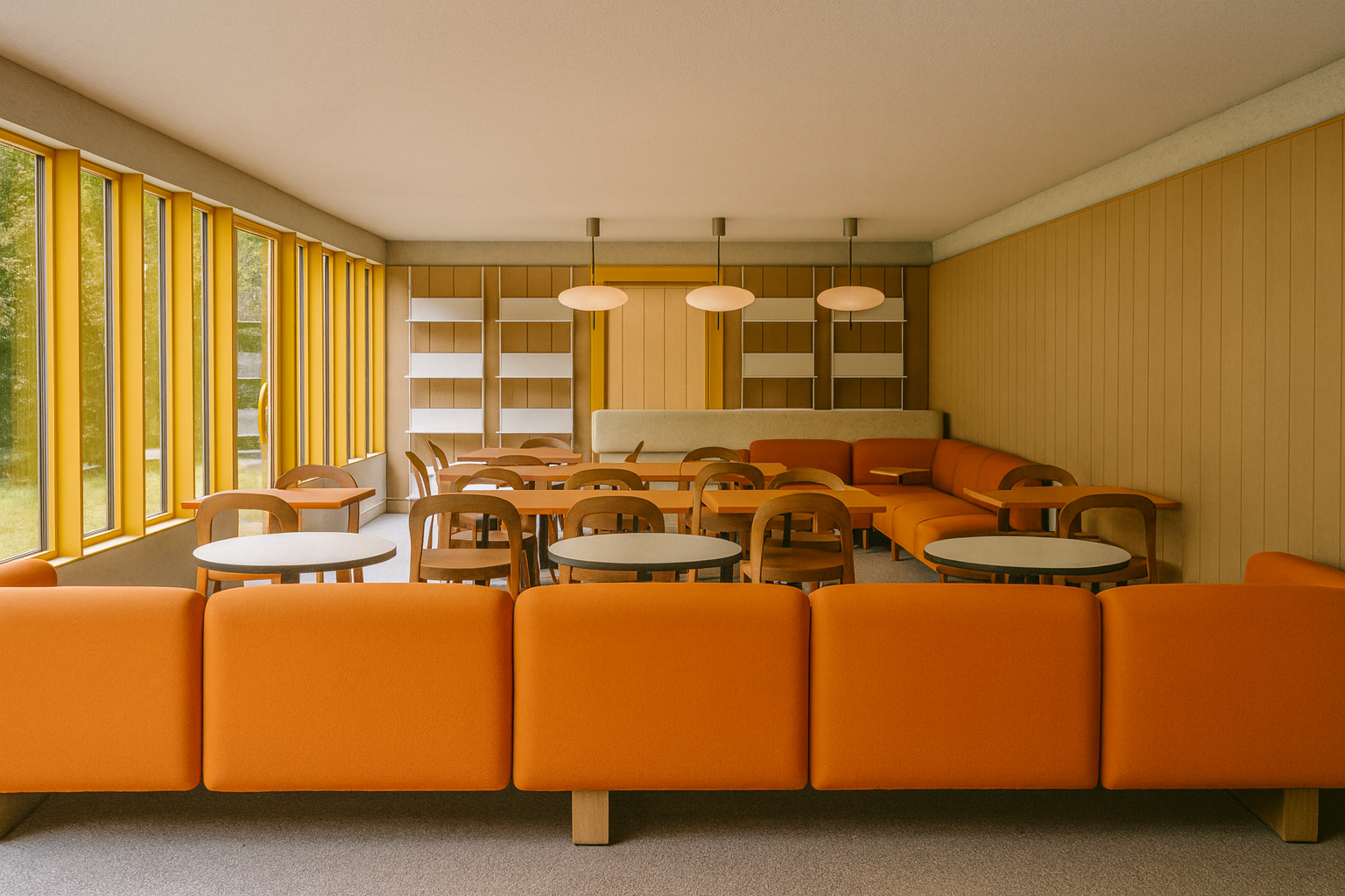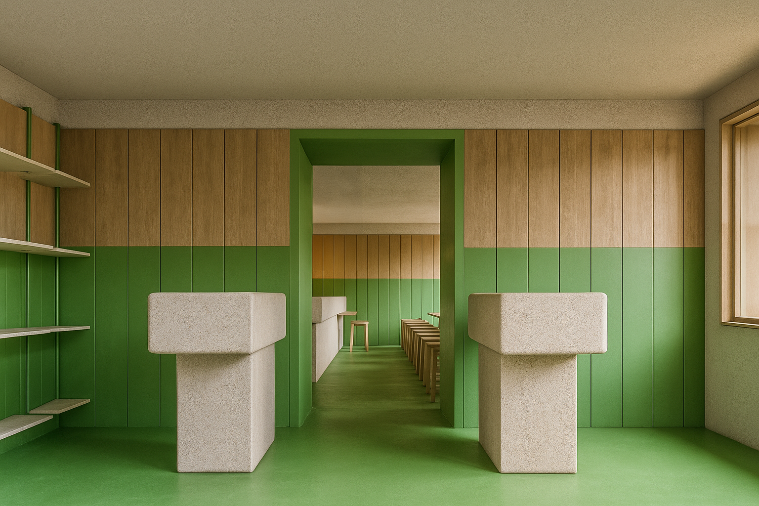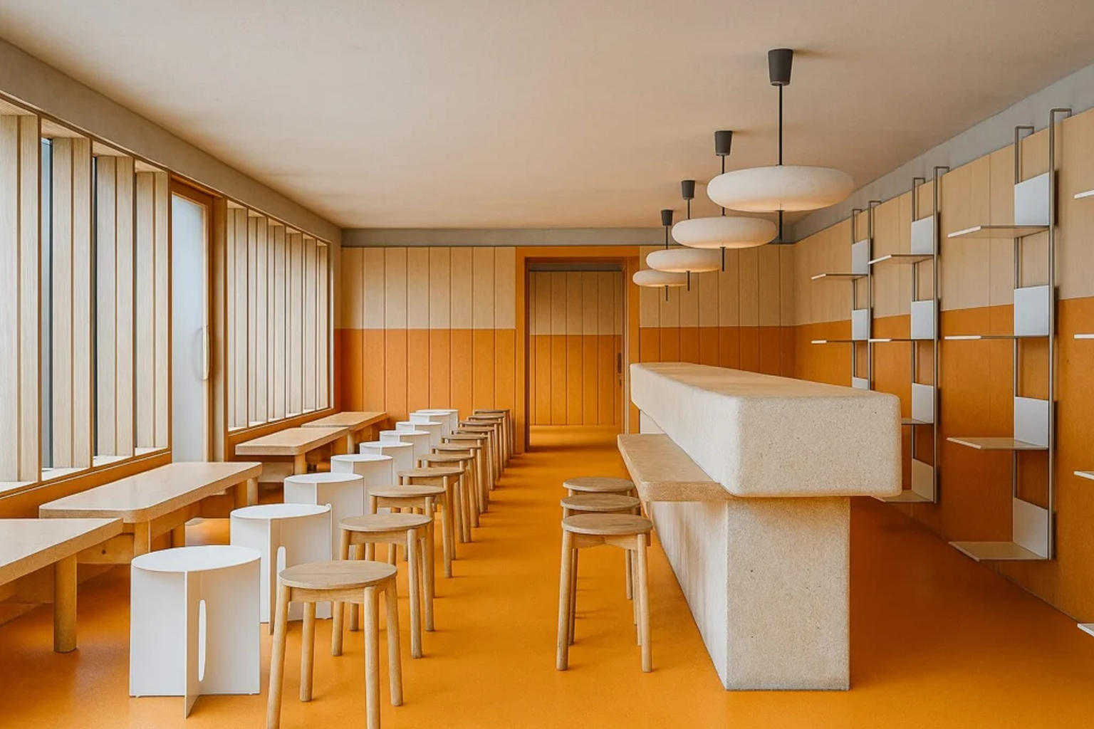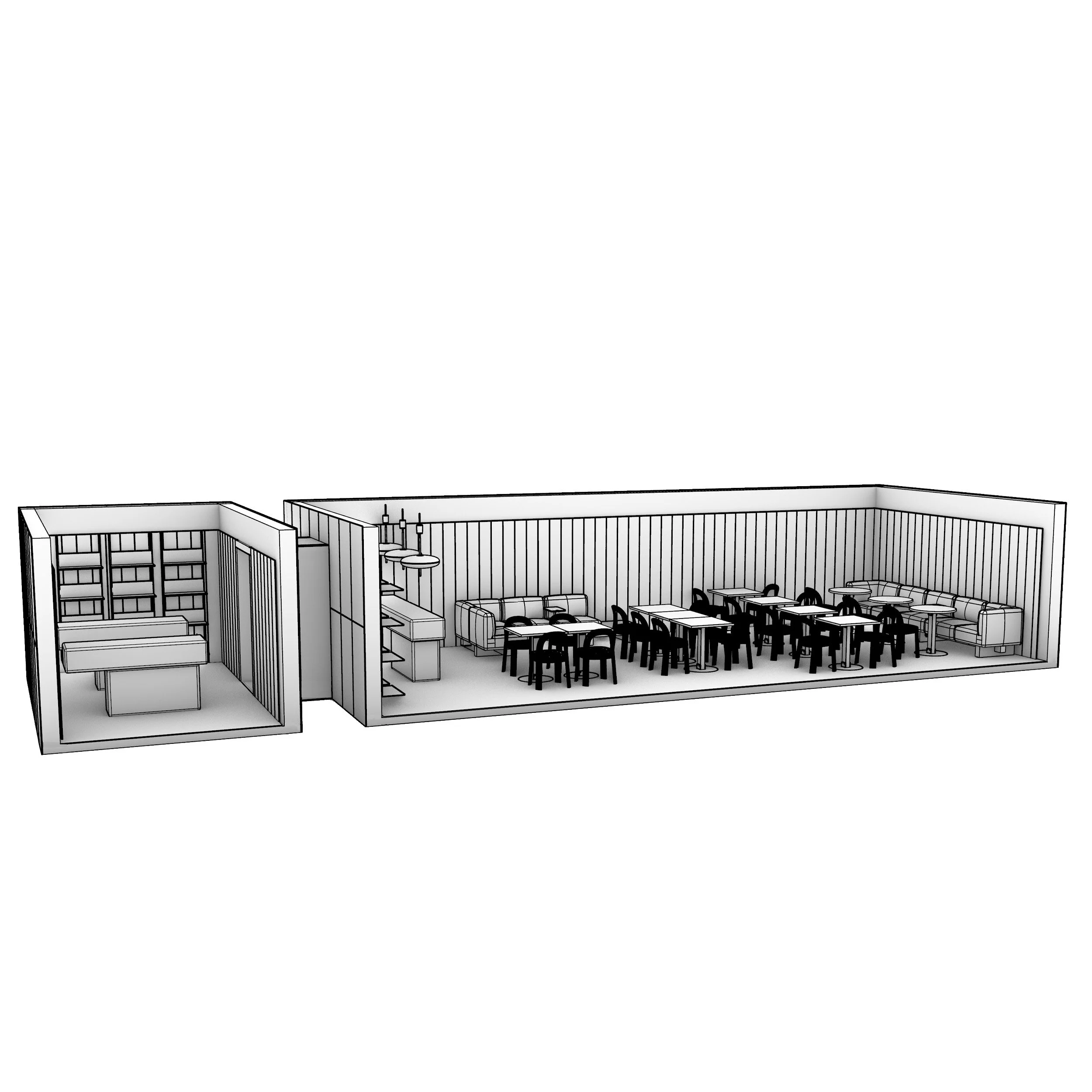CUBI - CAFE // Dine-in, a dining area for eating at the table, seating up to 30 guests. Generous counter, hidden storage & hanging Studio MacLean shelving.